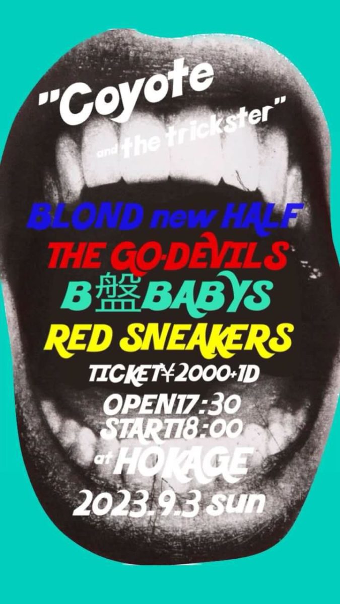 9/3(日) @ 心斎橋火影 “Coyote & the trickster”THE GO-DEVILSB盤BABYSRED SNEAKERSBLONDNewHALF